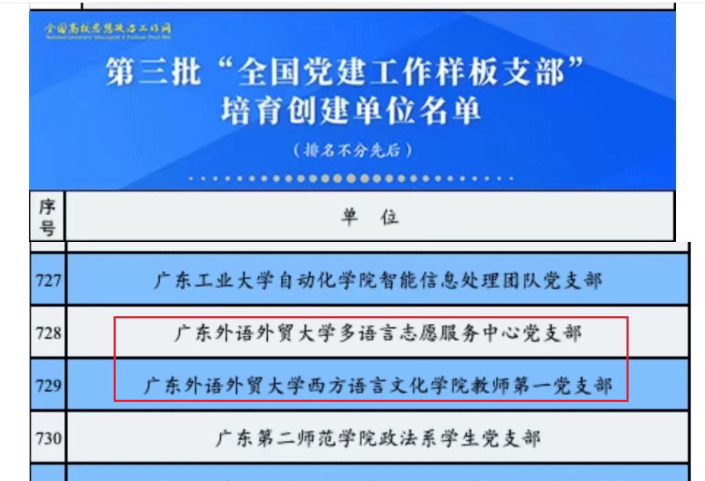 据悉,教育部于2021年下半年启动第三批新时代高校党建示范创建和质量创优工作,在全国范围内评选“党建工作示范高校”“党建工作标杆院系”和“党建工作样板支部”,广东省共获得示范高校2个、标杆院系9个、样板支部68个。我校西语学院教师第一支部一同入选。