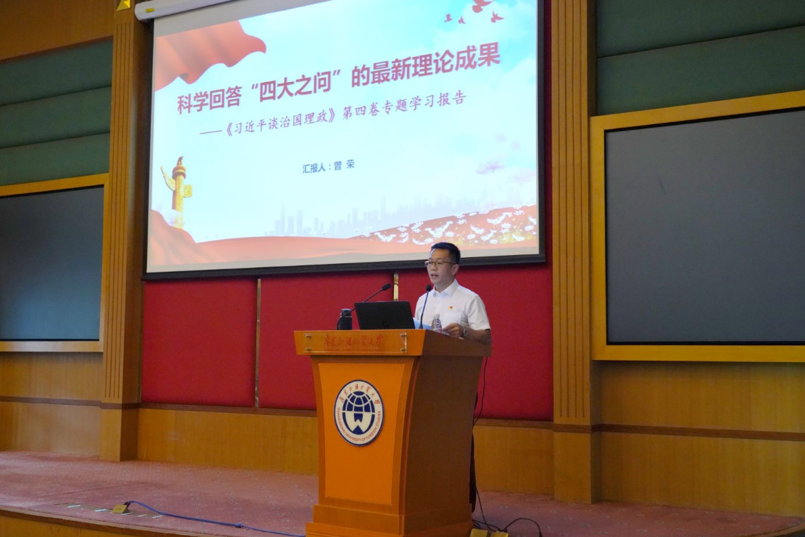 宣讲会由学校宣讲团成员、马克思主义学院曾荣教授主讲。曾教授以《科学回答“四大之问”的最新理论成果》为题,介绍了《习近平谈治国理政》 第四卷出版概况,从把握“两个结合”“两个大局”“两件大事”“两个答案”等4个方面,分析了科学回答中国之问 、世界之问、人民之问和时代之问等4个问题。同时,带领党员干部读原文、悟原理,用通俗易懂的语言和丰富的例子,引导大家如何结合学校实际和岗位职责,学好用好《习近平谈治国理政》第四卷,把党的创新理论转化为工作成效。授课深入浅出、联系实际强,对机关党员干部深刻认识和理解《习近平谈治国理政》第四卷的内涵具有重要的启发和指导意义。