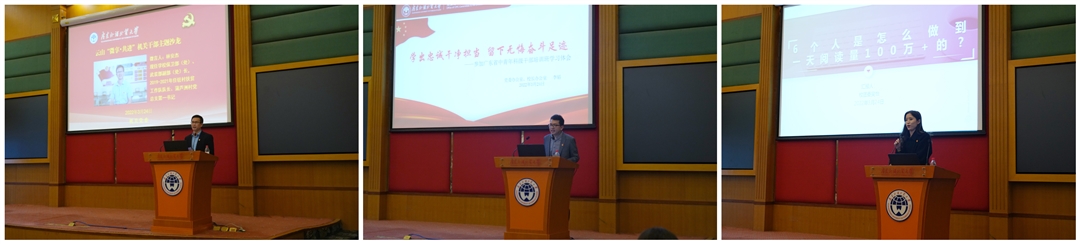 活动现场,来自保卫部(处)的林安杰、党校办的李韬和校团委的吴怡三位同事分别向与会人员分享了自己外出学习工作的经历和体会。其中林安杰向大家讲述了自己到阳山县蒲芦洲村开展驻村工作的经历,对“脚下沾有多少泥土,心中就沉淀多少真情”的理解和感悟;李韬以“学出忠诚干净担当、留下无悔奋斗足迹”为题,介绍了自己参加省委党校专题培训班学习的内容、收获与体会;吴怡结合自己借调上级部门工作的经历,与大家畅谈了如何结合青少年特点,做好新媒体工作。